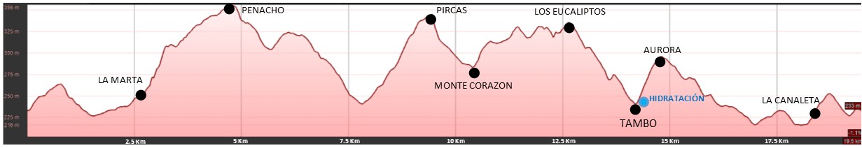 Se trata de un circuito de 20 km aproximados con 500 metros de desnivel positivo acumulado qué deberán transitar en 2 ocasiones (2 vueltas) para totalizar 40 km y 1000 metros de desnivel positivo.